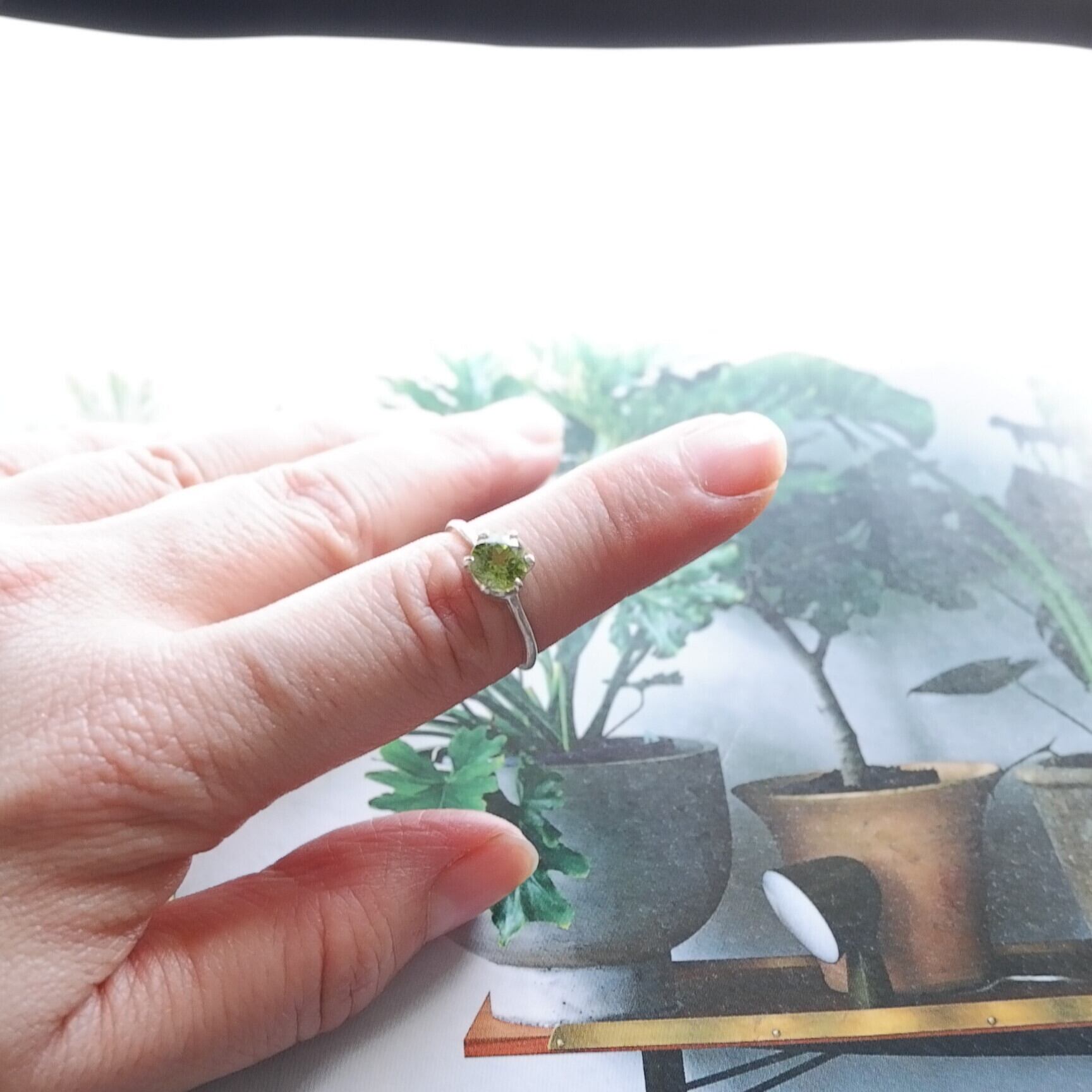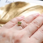 此方の作品はブリリアントカットされたペリドットを使用しており、光に反射してキラキラと輝いています。