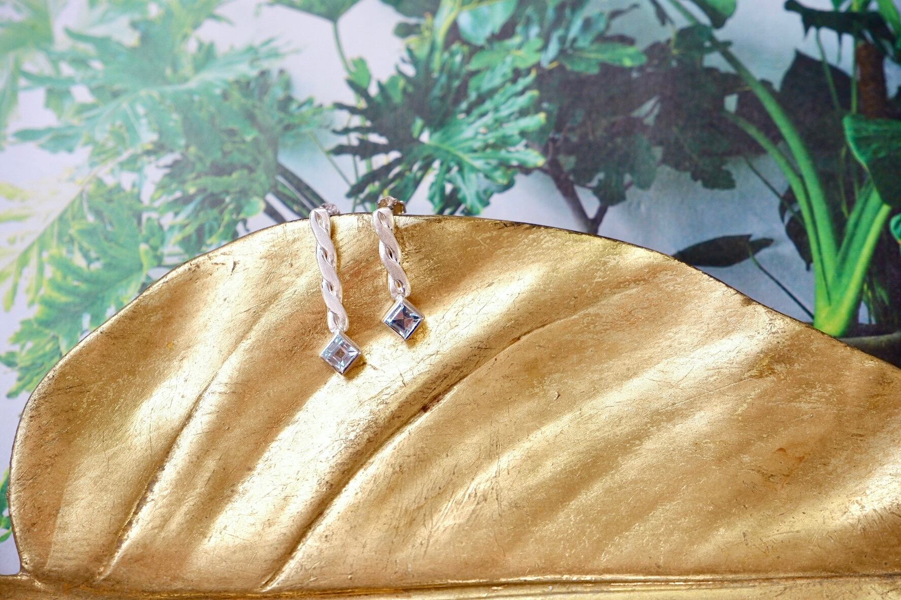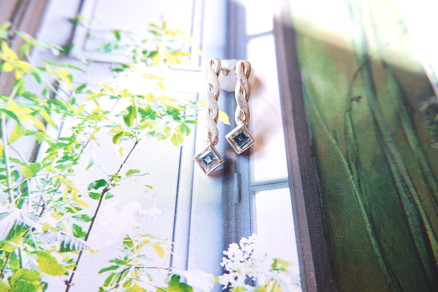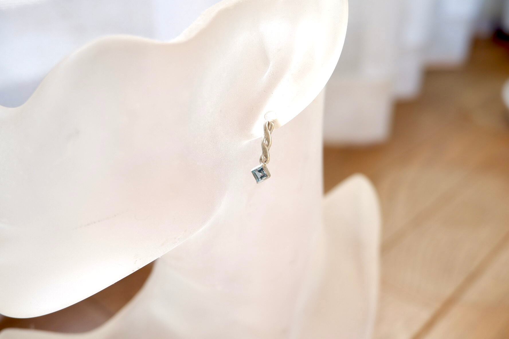 シルバー925素材に、スクエアカットの美しいアクアマリンが輝くデザインです。ピアスの表面にはダイヤモンドダスト加工が施され、上品な輝きを放ちます。