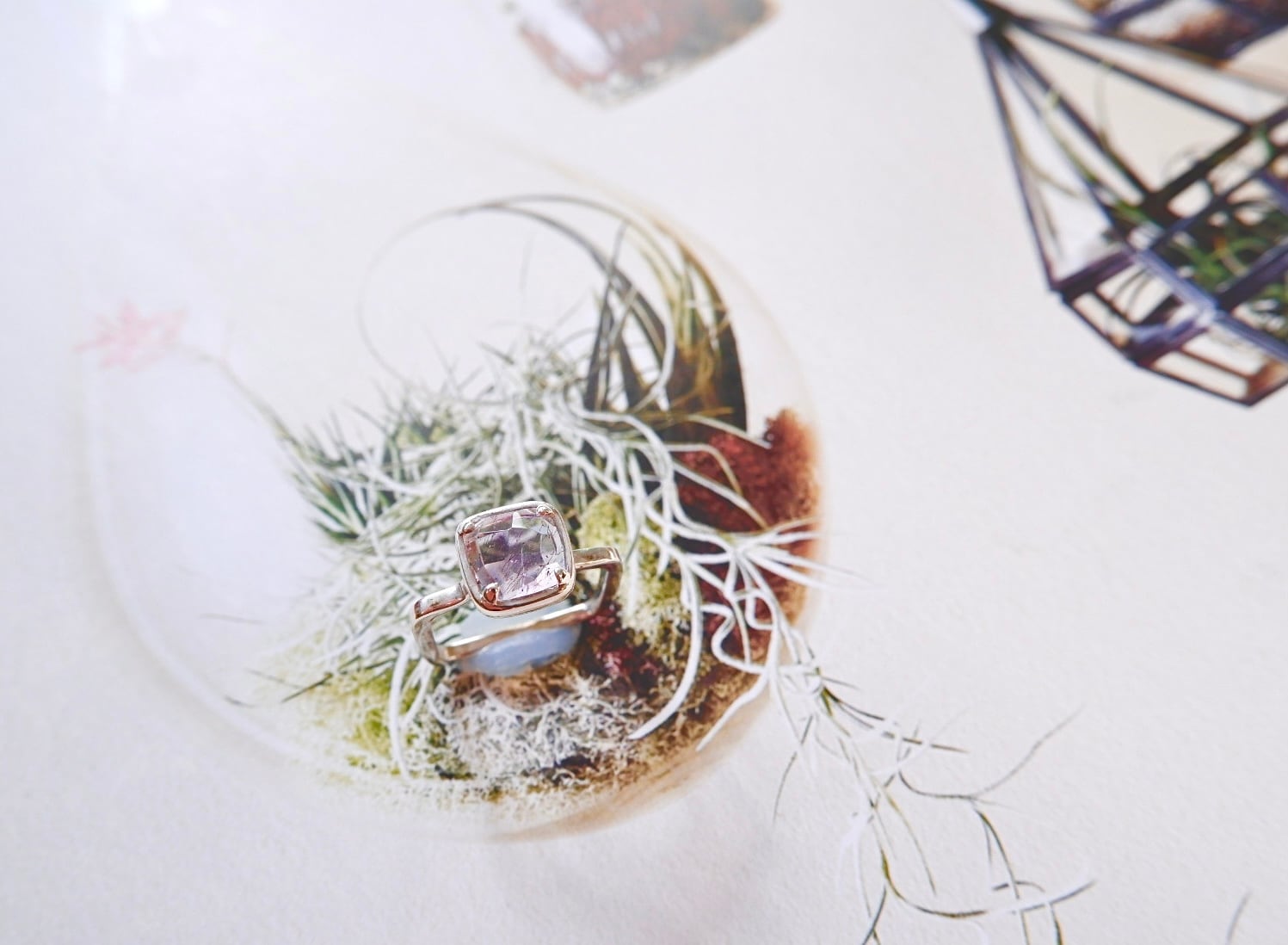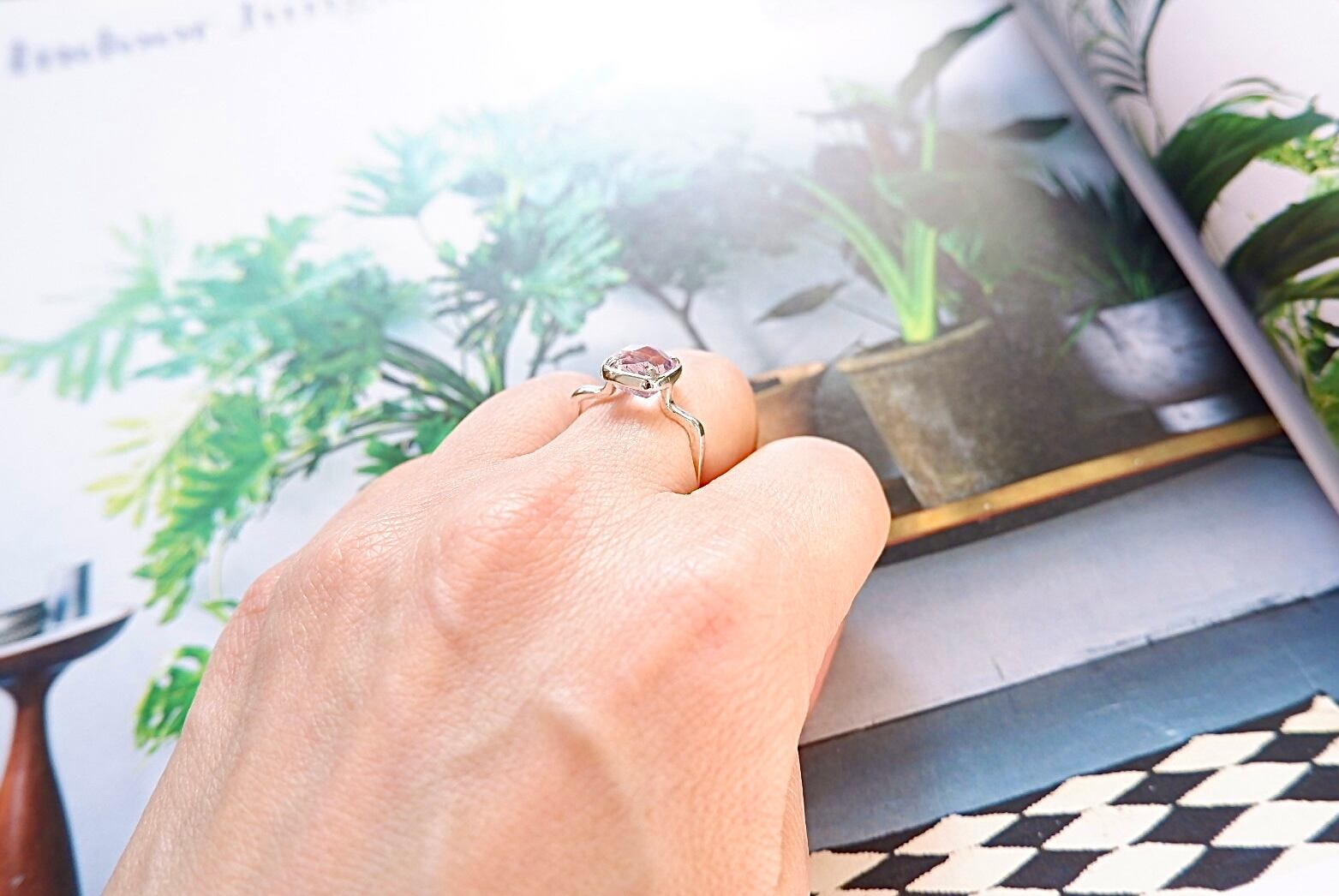 アメジストの透明感を最大限にを引き立てる枠に、四角形のリングを合わせたスタイリッシュなデザインで指先を美しく彩ります。