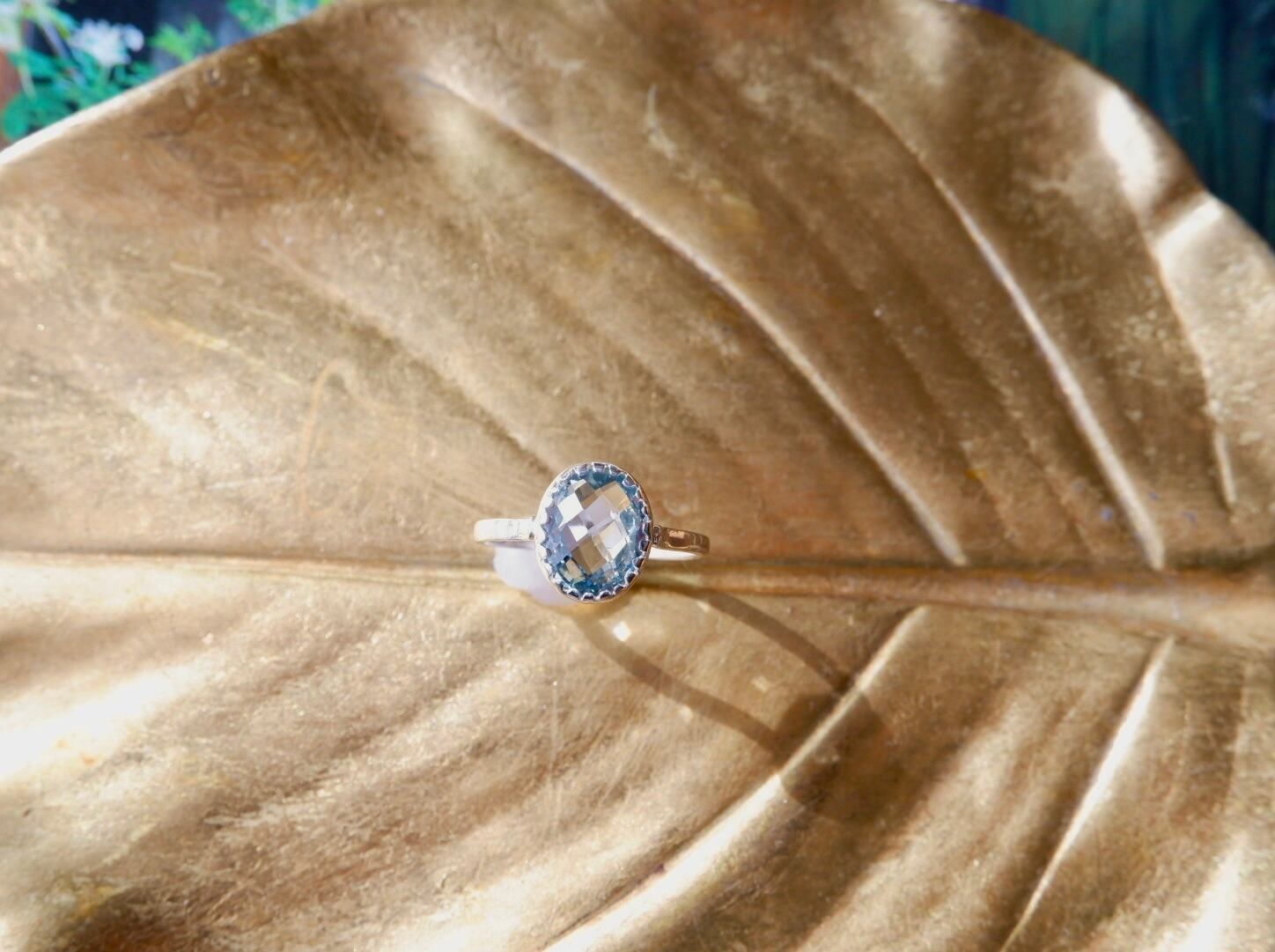 此方は透明感のあるブルーグリーンカラーが美しいトパーズを主役にしたリングです。
