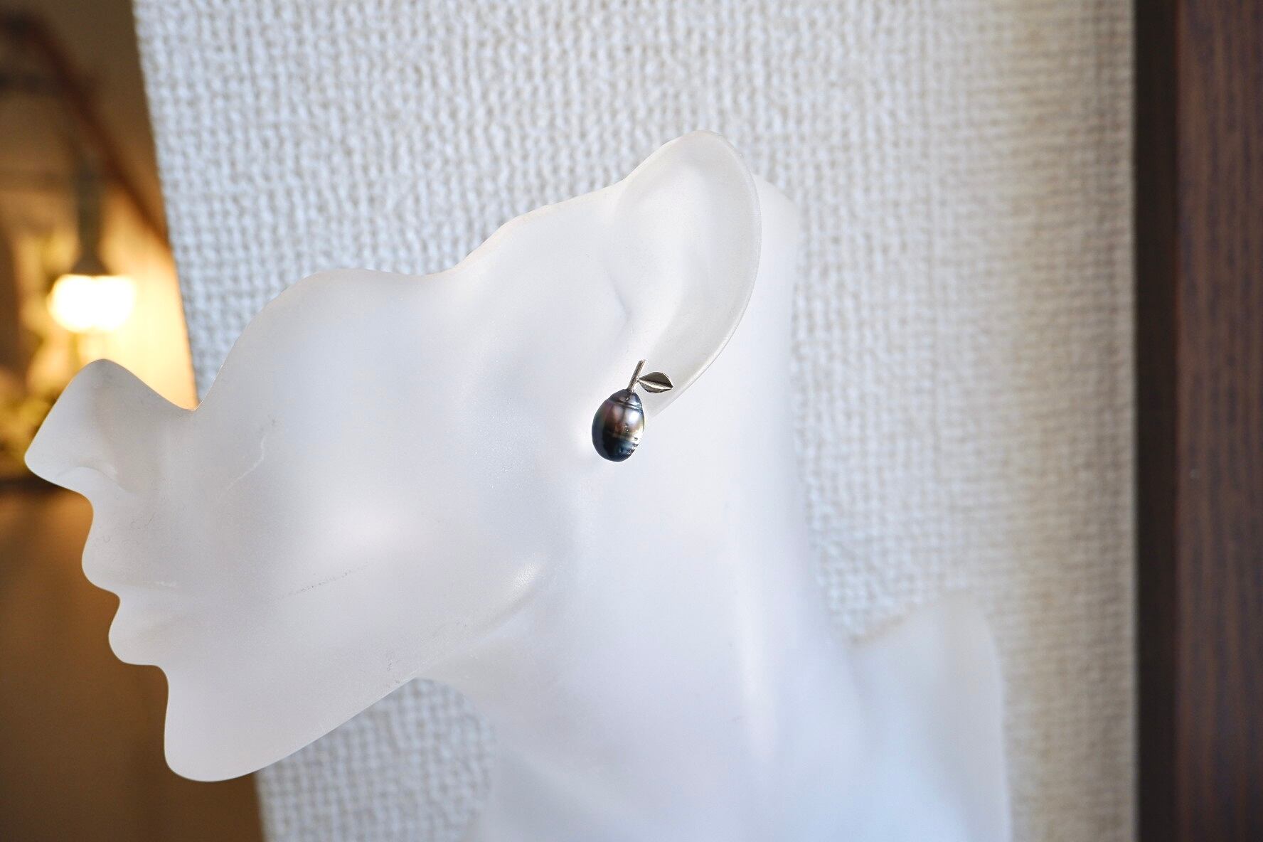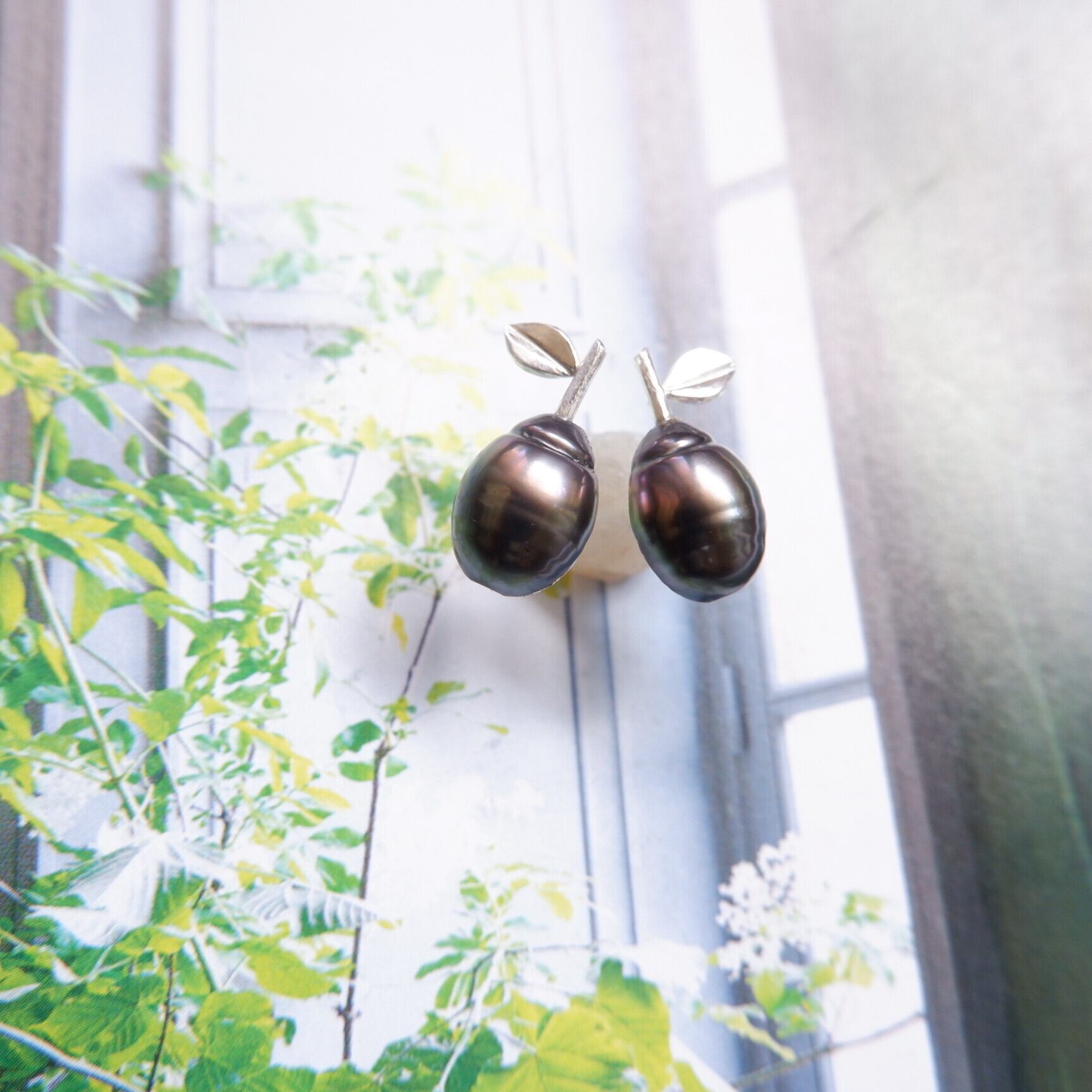 此方のピアスはピーコックグリーンやピンクの色味が見える鮮やかな黒真珠を使用したデザインピアスです。