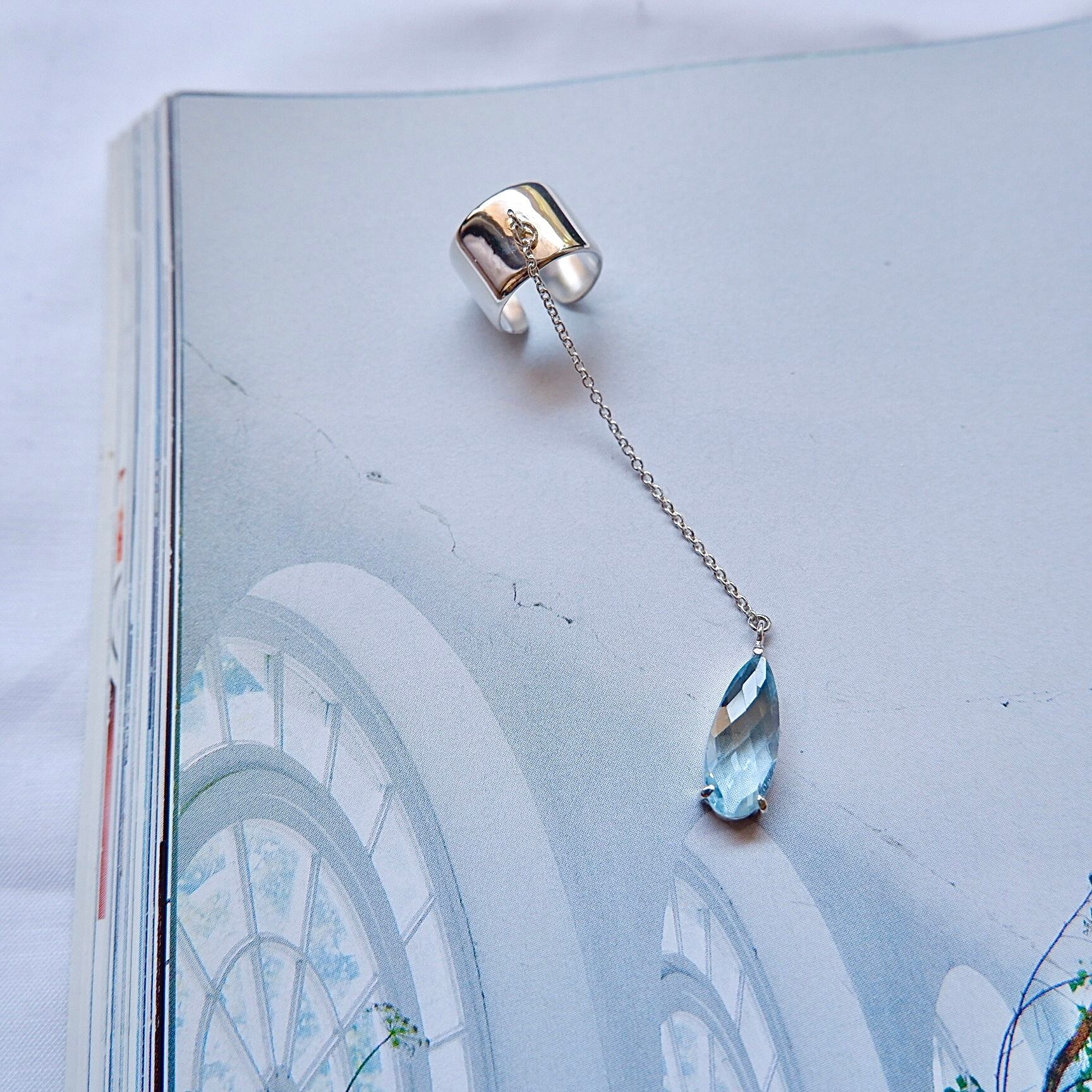 此方の作品は、ブルートパーズを使用したヘリックスイヤーカフです。ドロップカットのブルートパーズが優雅に輝き、耳元にひときわ良いアクセントを加えます。